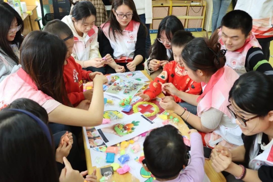 志愿者向孩子们展示黏土制作的简单可爱模型成品,激发孩子们兴趣,示范制作简单黏土造型,如药学相关的胶囊、药箱以及各类模型。孩子们自己动手制作,捏出会微笑的药丸,抱着小花的兔子,和各种可爱的花朵装饰。当志愿者用手和语言表示出“你真棒”,孩子们眼里的光就是最好的勋章。