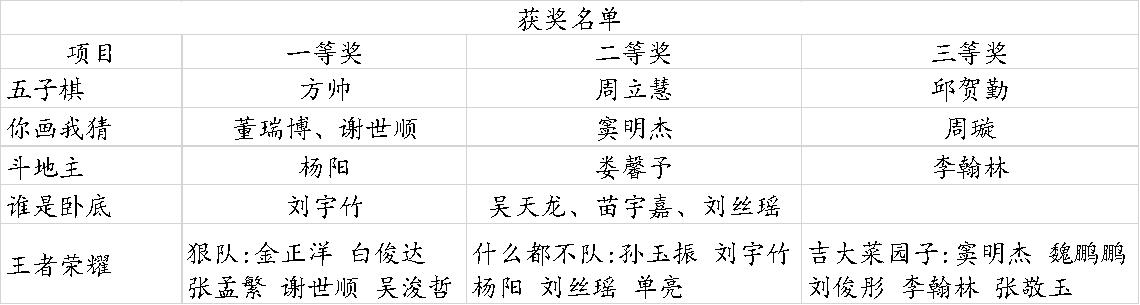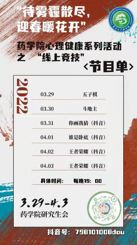 全体研究生在线投票选出五个项目,有益智小游戏,五子棋、你画我猜;娱乐小游戏,谁是卧底、斗地主,以及电子竞技游戏,王者荣耀。所有活动均通过相应的游戏小程序或app在线进行比赛,并通过抖音进行实时直播。