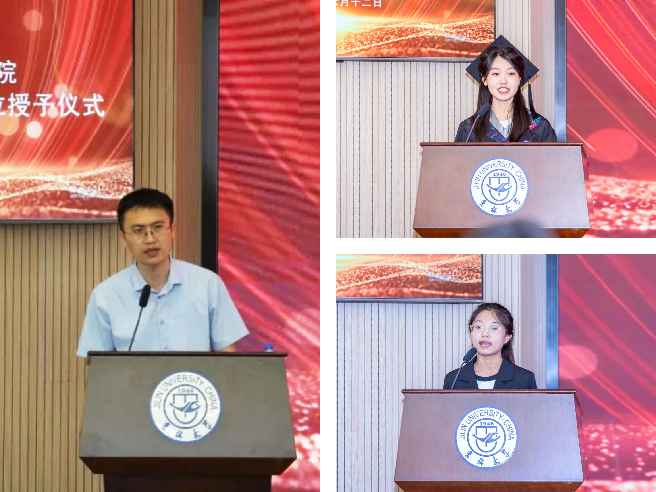 在师友寄语环节,教师代表王志寒深情寄语全体学子。他勉励大家始终牢记求学初心,在未来的人生道路上保持乐观进取的精神风貌。优秀毕业生代表姜姗珊同学上台发言,言辞恳切地向悉心栽培的学院和母校致以诚挚谢意。她表示,在未来的征程中将继续砥砺前行,为梦想全力以赴。在校学生代表武梦瑶同学也送上了对毕业生们的美好祝福,鼓励大家勇敢追逐梦想,不断攀登人生高峰。