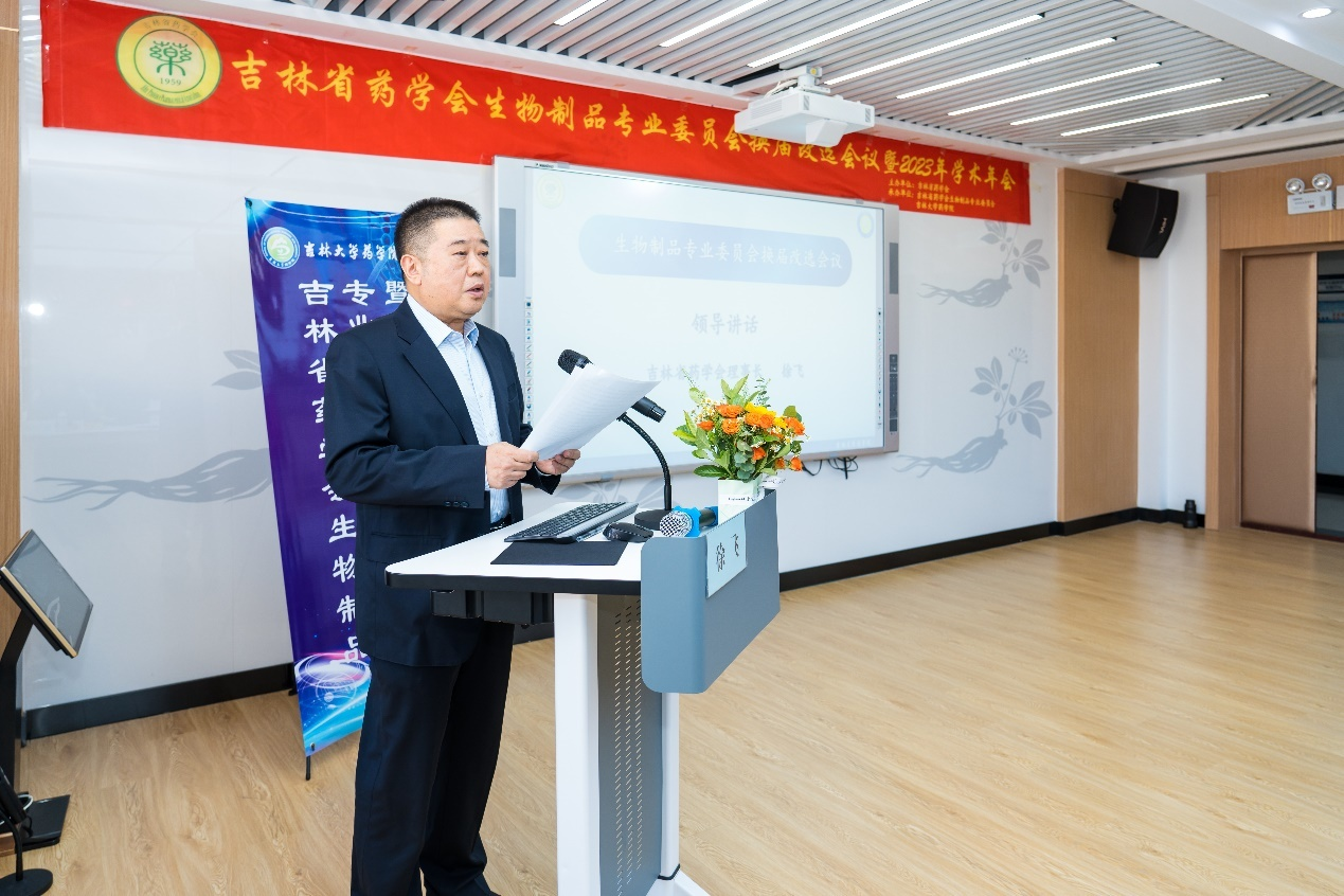 其次,吉林省药学会理事长徐飞代表省药学会致词。在讲话中徐飞理事长对会议的召开表示衷心的祝贺,肯定了生物制品专委会在推动我省生物制品行业的科技创新和产业发展方面做出的努力和贡献,对新一届生物制品专业委员会提出了工作希望和要求。
