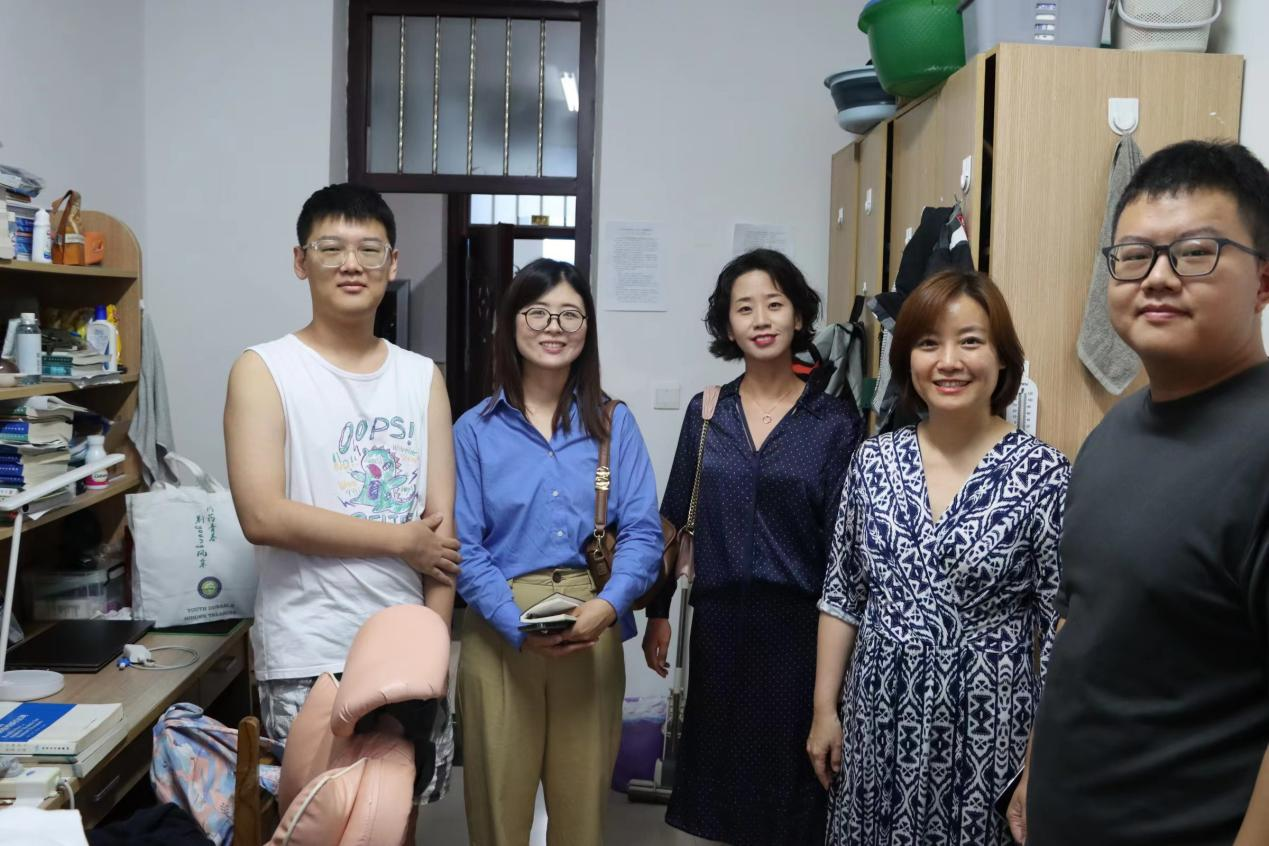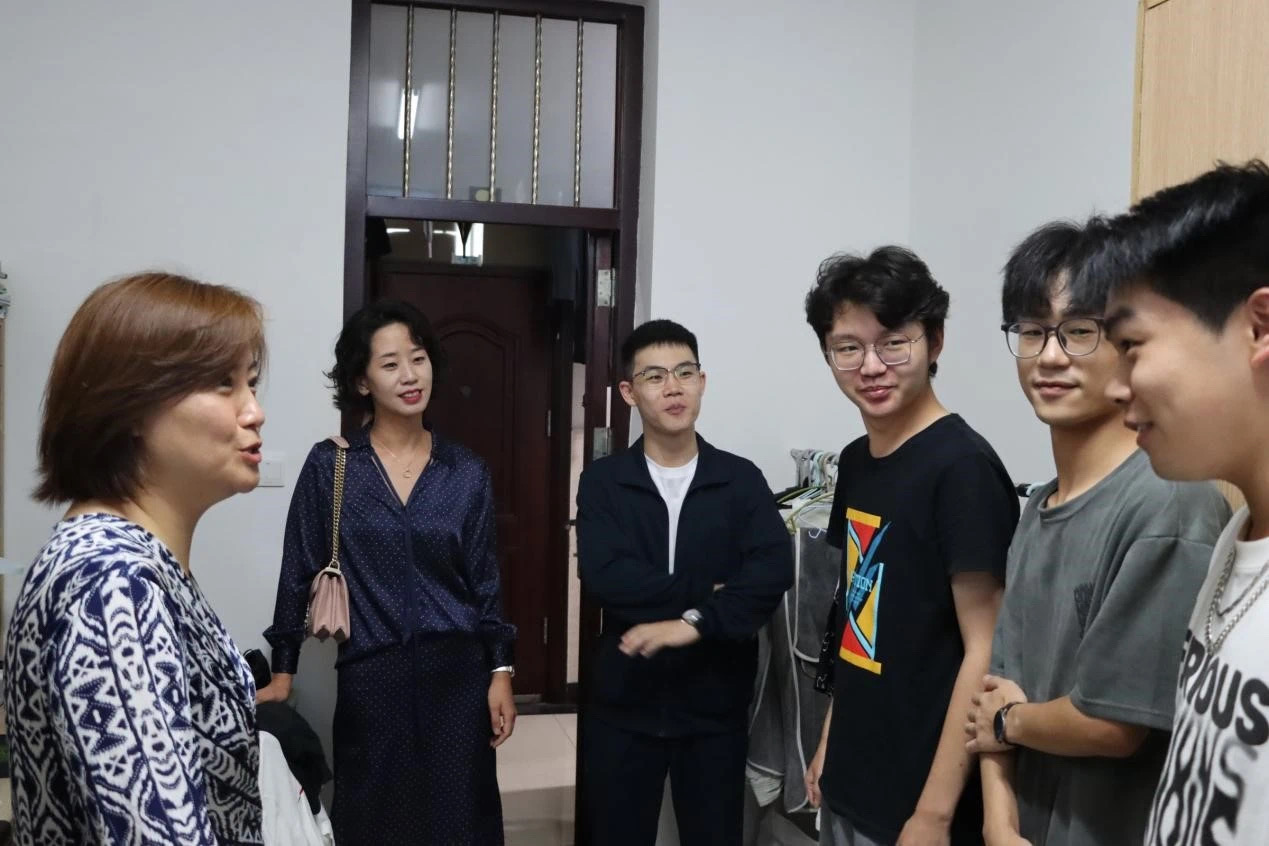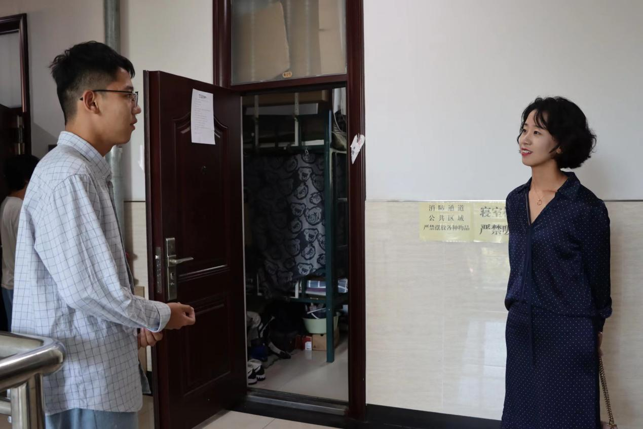 党委书记曲渊立、党委副书记刘丽慧、学生工作办公室主任王托及辅导员刘锦澍、杨博斐对新民校区的学生进行走访慰问。