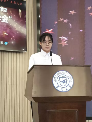 接着,由本科获奖学生代表2020级临床药学专业的曹辰瑀同学发言。曹辰瑀同学首先对吉林省博大伟业制药有限公司对学校及学院的支持表达了感谢,并总结了自己获奖的原因。最后鼓励学弟学妹们积极上进,不懈奋斗争取成为更好的自己!