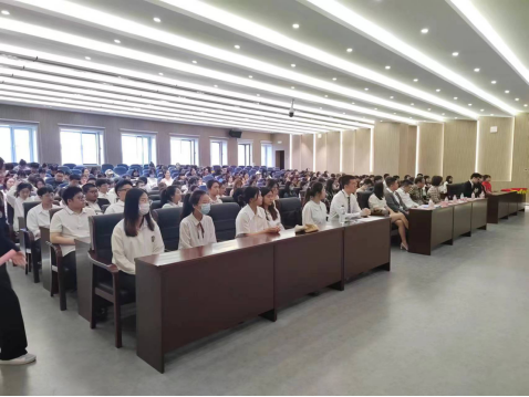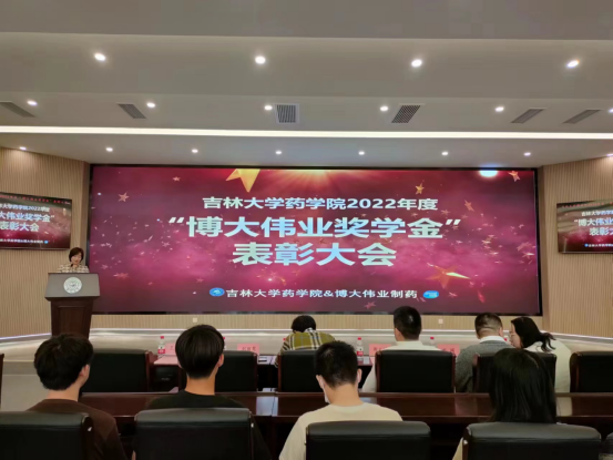 党委副书记、副院长刘丽慧,吉林省博大伟业制药有限公司总经理谢文博,吉林省博大伟业制药有限公司药物研究院副院长田阔,吉林省博大伟业制药有限公司人力资源部部长辇懿敏。同时在场的还有33位获奖同学及2021级全体同学。