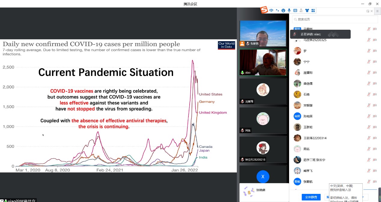 全体师生,每次讲座配1名驻课青年教师。5位教授分别从药物研发、药理机制、研究方法、科研选题等角度,结合新冠疫情等热点为同学们带来不同专题讲座。提问互动环节中,同学们踊跃发言。本次课程参与师生累计超过1000人次,并在每日讲座结束后填写调查问卷,对讲座效果进行实时反馈。参会学生们表示,本次活动受益匪浅,扩宽了学术视野,加深了对科研的理解,增加了对药学专业的信心,为日后继续深造指明了方向。参加课程学习的老师们表示,此次课程为他们搭建了国际合作科研平台,为推动进一步的国际科研合作奠定了良好的基础。学院将以此为契机,多措并举多方着力,持续形成人才培养的国际化、高质量的良好局面。